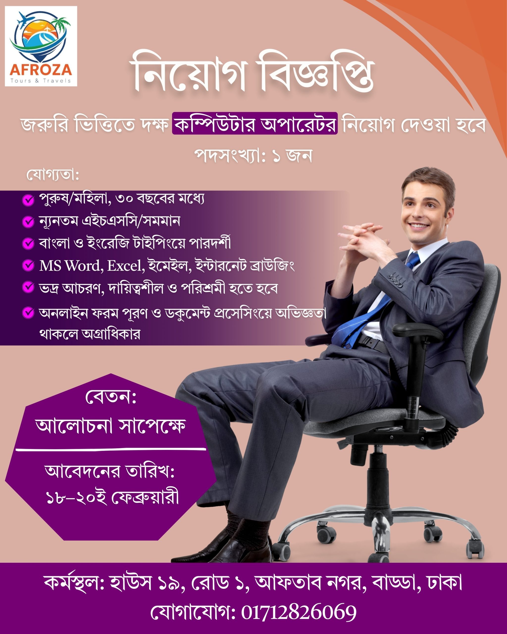 রাজধানীর আফতাব নগরে অবস্থিত আফ্রোজা ট্যুরস এন্ড ট্রাভেলস তাদের প্রতিষ্ঠানের জন্য জরুরি ভিত্তিতে একজন দক্ষ কম্পিউটার অপারেটর নিয়োগ দেবে। আগ্রহী প্রার্থীদের নির্ধারিত সময়ের মধ্যে সরাসরি যোগাযোগের আহ্বান জানানো হয়েছে।