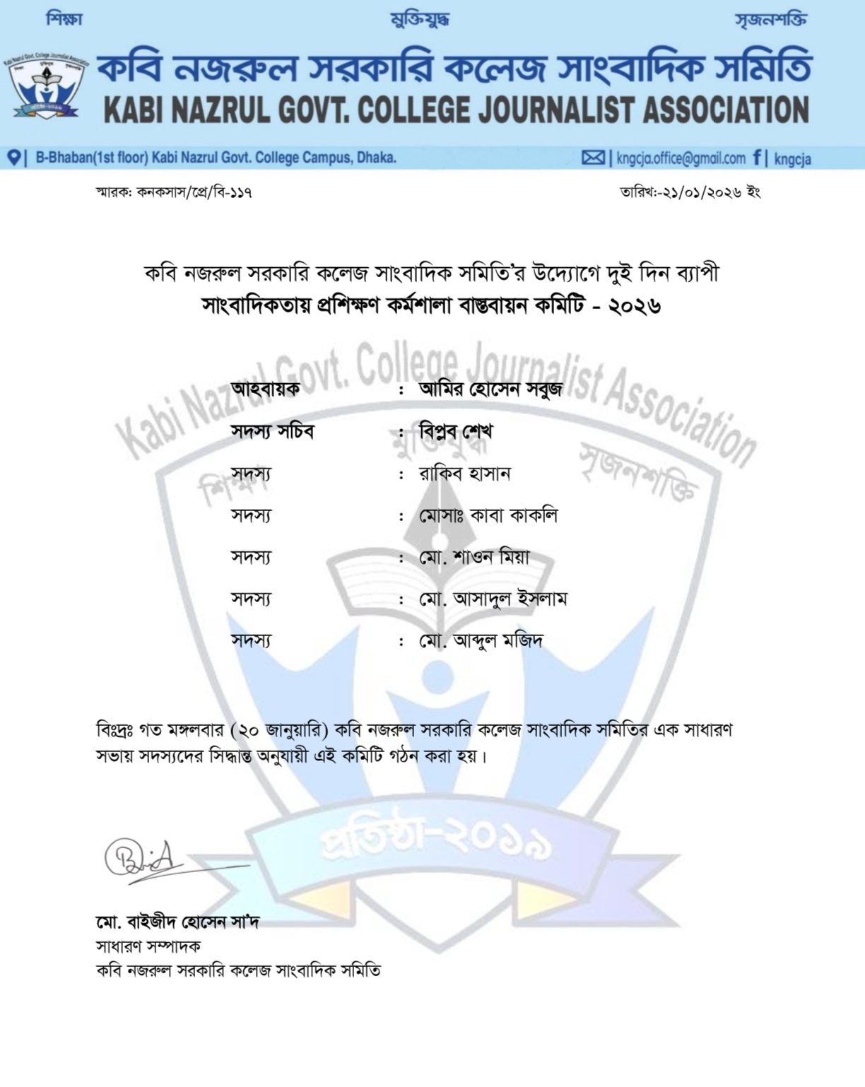 বুধবার (২১ জানুয়ারি) কবি নজরুল সরকারি কলেজ সাংবাদিক সমিতির সাধারণ সম্পাদক মো. বাইজীদ হোসেন সা’দ স্বাক্ষরিত এক প্রেস বিজ্ঞপ্তিতে এই কমিটি ঘোষণা করা হয়।