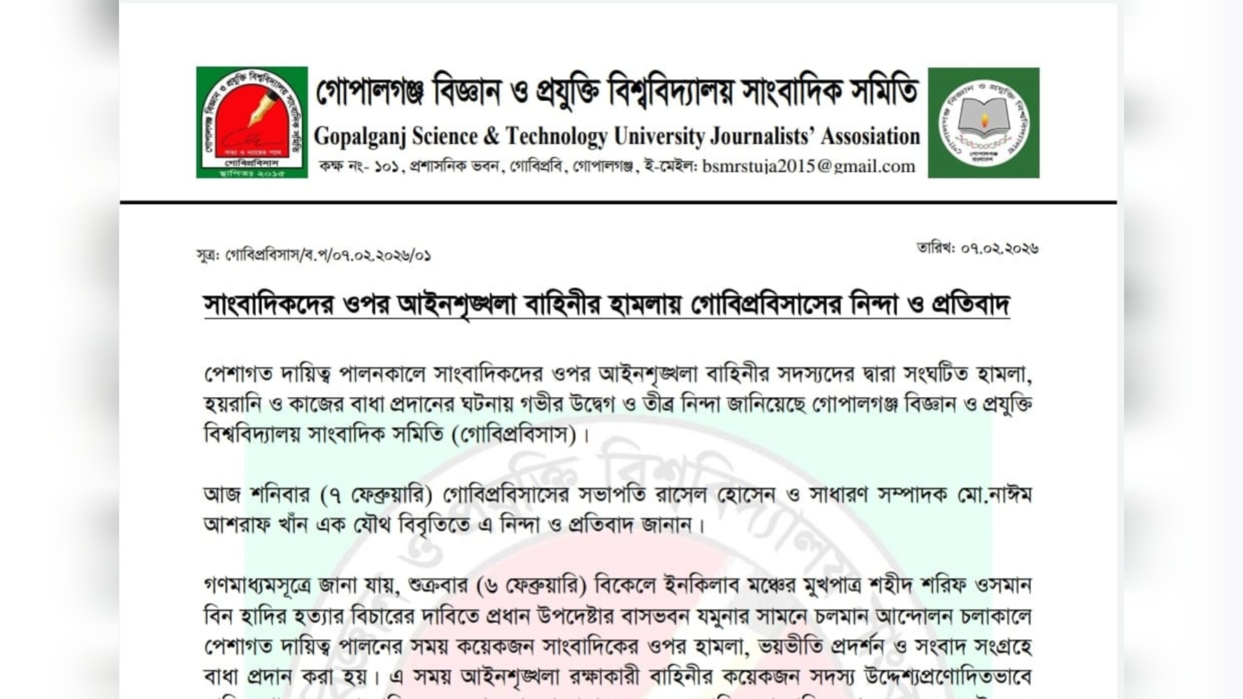বিবৃতিতে আরও বলা হয়, গোবিপ্রবিসাস নেতৃবৃন্দ এই ঘটনার সঙ্গে জড়িত সকল দোষীর দ্রুত সনাক্তকরণ, নিরপেক্ষ তদন্তের মাধ্যমে দৃষ্টান্তমূলক শাস্তির দাবি জানাচ্ছে। একই সঙ্গে ভবিষ্যতে সাংবাদিকদের নিরাপদ ও স্বাধীনভাবে কাজ করার পরিবেশ নিশ্চিত করতে সংশ্লিষ্ট কর্তৃপক্ষের প্রতি জোর দাবি জানানো হচ্ছে।
