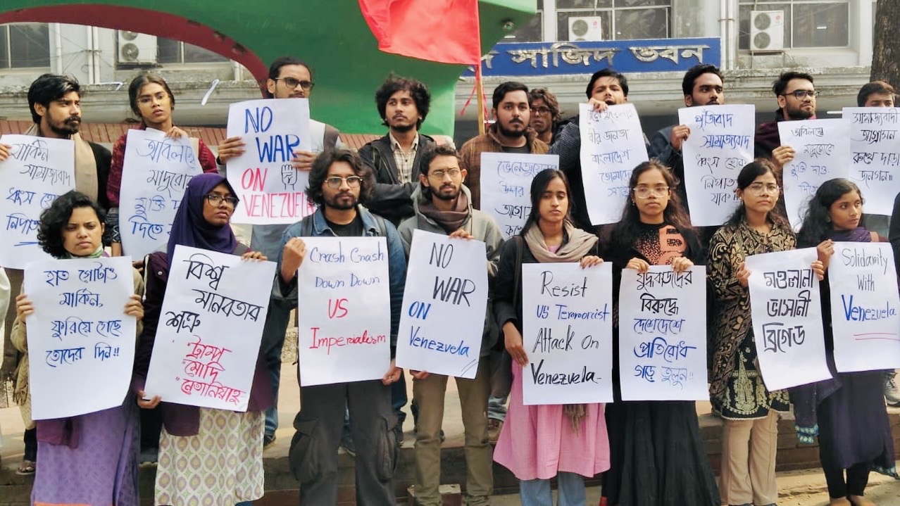 ভেনেজুয়েলায় মার্কিন হামলার প্রতিবাদে জবিতে মওলানা ভাসানী ব্রিগেডের মৌন মিছিল