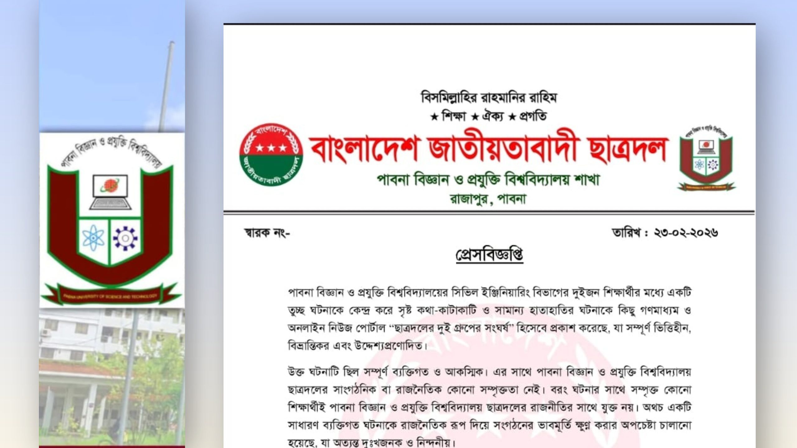 মারামারিতে জড়িত দুই শিক্ষার্থী ছাত্রদলের কেউ নয় দাবি পাবিপ্রবি ছাত্রদলের